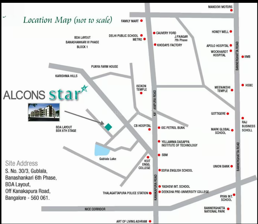Alcons Star is a residential project by Alcons Builders and Developers located at Subramanyapura in Bangalore. The key amenities of the project include Landscaped Garden, Power Backup, Cycling & Jogging Track, Gymnasium and Swimming Pool. Owing to its location, facilities such as schools, hospitals, ATMs, and markets are available at a close distance from Alcons Star. An extensive network of public transports in the close vicinity makes the project accessible.